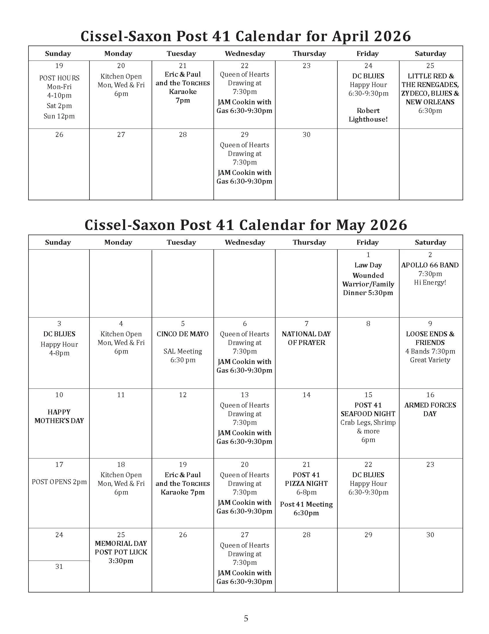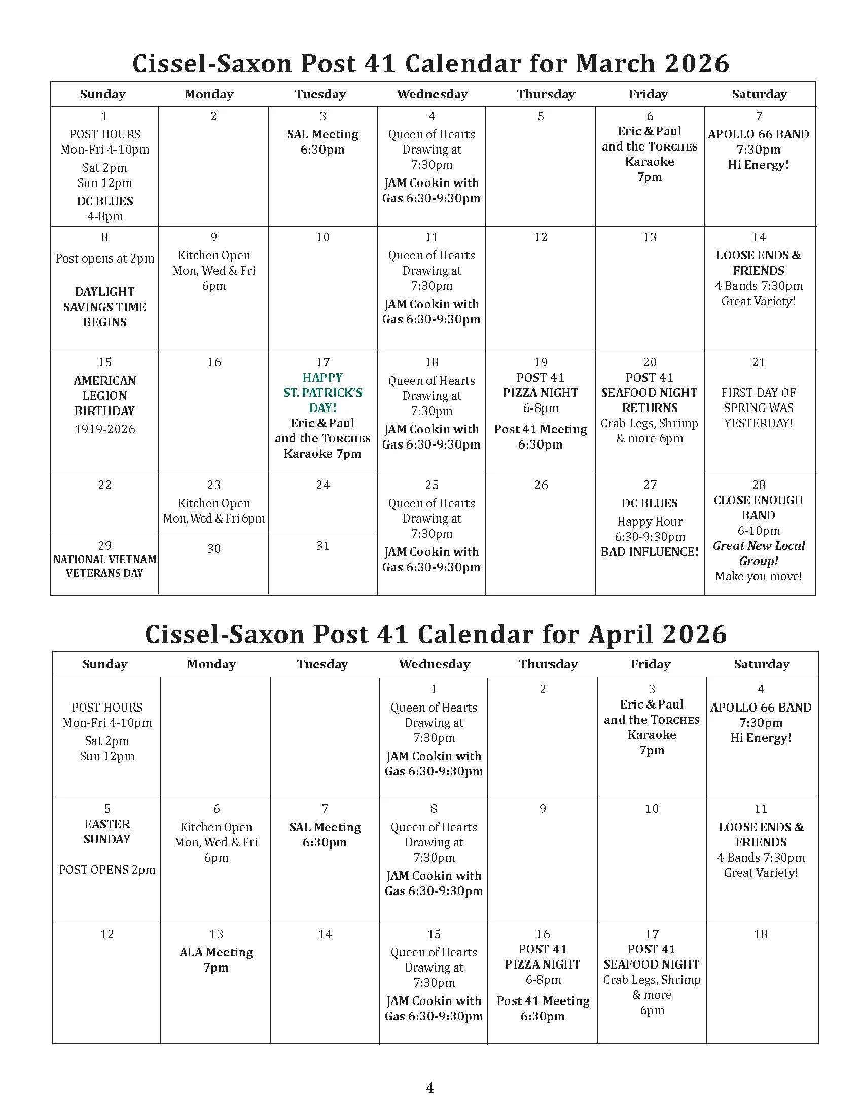 Vision & Mission Post 41 Family Members Officers & Staff Sons of the American Legion American Legion Auxiliary American Legion Riders Community Partners New Page Programs & Services Veterans Services Community Programs Calendar Live Music and Entertainment "Live at the Legion!" Meals, Banquets & Weekly Dinners Rent Our Facility Little Red & the Renegades Join Us Become a Member News & ViewsGalleryContact